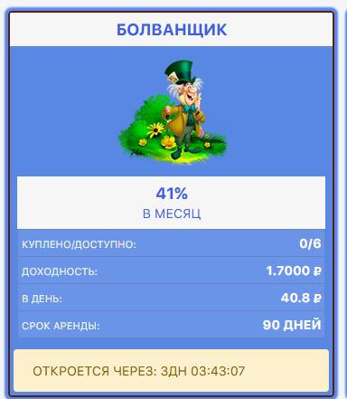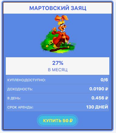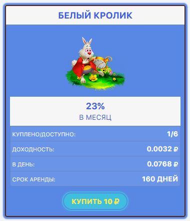 Это современная экономическая игра, которая позволяет не только интересно проводить время, но и зарабатывать реальные деньги. Став пользователем нашего замечательного игрового проекта, вы сможете прокачать свои финансы, для этого нужно – приобретать персонажей, которые начнут приносить прибыль, которая попадает к вам на баланс. А также рекламировать свои ссылки на нашем сайте, либо смотреть серфинг. На нашем проекте все функционнирует в автоматическом режиме, как оплата рекламы так и вывод заработанных средств. Разработкой проекта занималась команда профессионалов, а это значит, что наш проект работает бесперебойно и доступен всегда! Также пользователи могут быть уверены в сохранности своих вложений – высокий уровень безопасности позволяет нам это гарантировать. Обратите внимание, что за регистрацию на нашем проекты вы получите персонажа Белый Кролик с сроком аренда на 50 дней. Обратите внимание, что у нас на проекте есть два вида персонажей: обычные и vip. Обычные персонажи приносят прибыль ежедневно а VIP персонажи только в конце своего срока аренды. Также вы можете заработать у нас в бонусной системе, у нас их 5 видов.