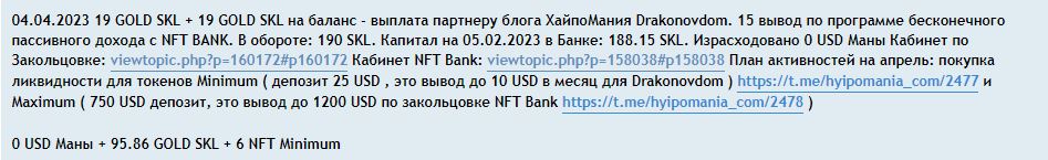 В феврале 2023 выполнили условия акции "до 60% прибыль при покупке ликвидности к NFT "Minimum"": покупка ликвидности к NFT Minimum на 25 USD - при участии в 2 акциях - января и февраля - максимальный вывод на "наслаивающиеся " месяцы - до 15 USD , количество выводов продлевается до полного исчерпания сумм выводов обеих акций - 30+40 ( до 70 USD )