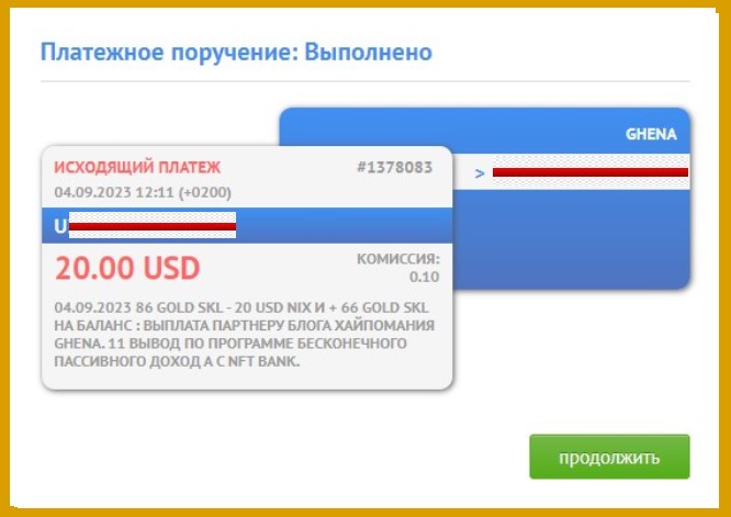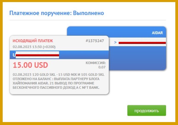 02.08.2023 60 GOLD SKL - 15 USD Nix и 45 GOLD SKL отложено на баланс - выплата партнеру блога ХайпоМания tfartem 13 вывод по программе бесконечного пассивного доход а с NFT BANK. В обороте: 600 SKL. Капитал на 06.05.2023 в Банке: 1,050.00 regular SKL. Израсходовано 15 USD Маны Кабинет по Закольцовке: https://hyipomania.com/forum/viewtopic. ... 37#p160237 Кабинет NFT Bank: https://hyipomania.com/forum/viewtopic. ... 86#p156486 Участие в Плане Оптимальный-1 с депозитом 20 USD до 20.07: это получение до 100 USD ежемесячно в Лотерее NFT Bank https://t.me/hyipomania_com/2519 , до 250 USD ежемесячно по акции Адаптация https://t.me/hyipomania_com/2510 и до 100 USD ежемесячно по Закольцовке с NFT Bank https://t.me/hyipomania_com/2488
