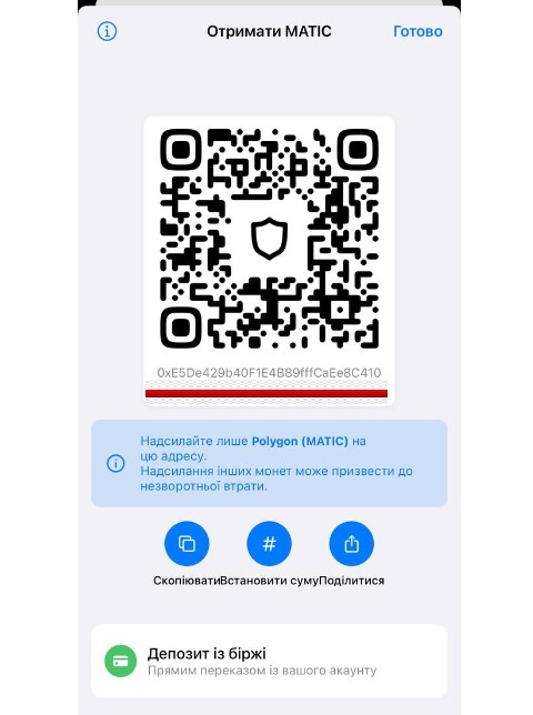 3. Копируем свой адрес для токена Matic ( Polygon ) и пополняем его из внешнего кошелька , типа MetaMask или напрямую привязываем к бирже Binance ( https://www.binance.com/ru/register?ref=J2FX6MQK ) и пополняем оттуда.