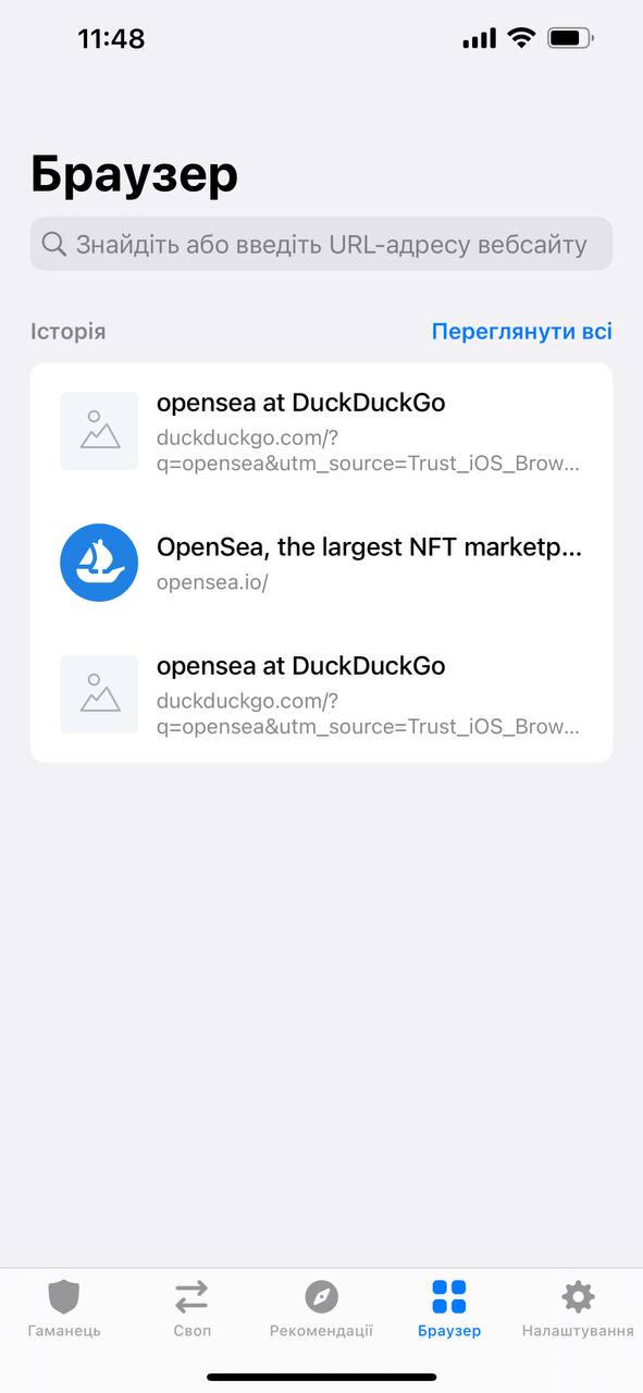 4. Заходим на вкладку "Браузер" в кошельке и в поиске находим маркетплейс Opensea.