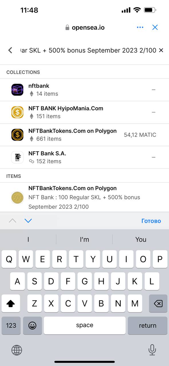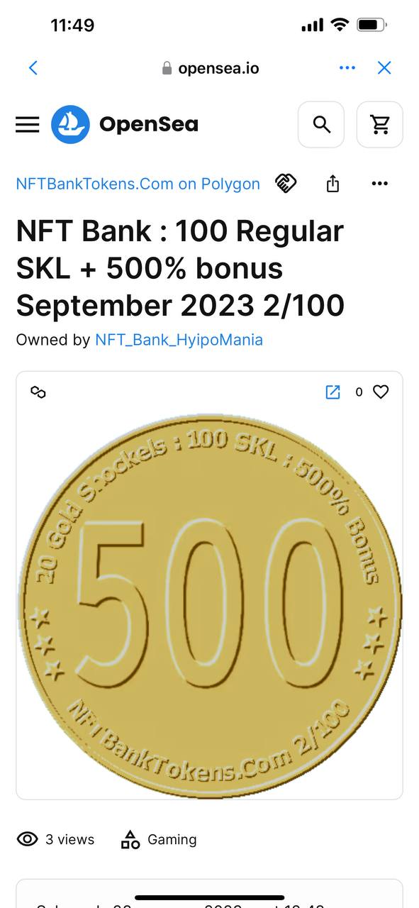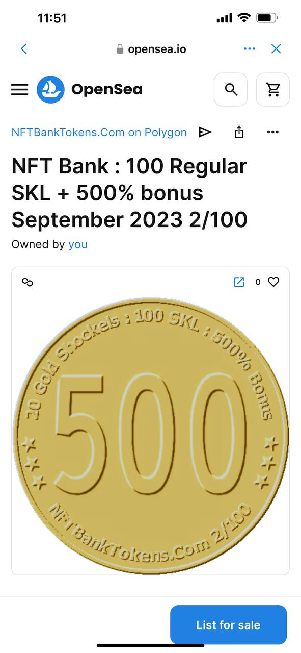 6. По поиску маркетплейса Opensea находим нужный нам NFT , например по плану Оптимальный от NFT Bank мы должны купить NFT NFT Bank : 100 Regular SKL + 500% bonus
