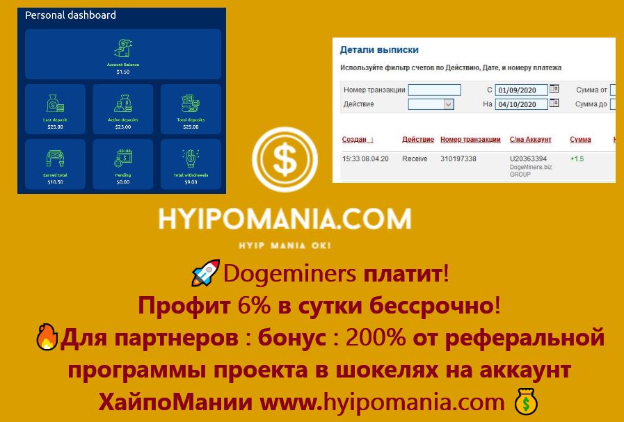 Re: Обзор бессрочника Dogeminers с доходностью от 6% в сутки ( бонус ХайпоМании 200% )