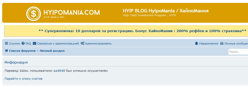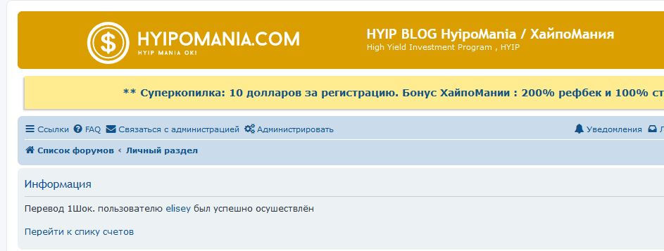 Re: Призы от ХайпоМании первым 100 участникам: 1 USD на баланс форума!