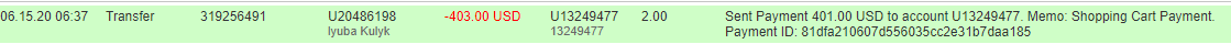 The amount of 14.5 USD has been withdrawn from your account. Accounts: U20->U13249477. Memo: Shopping Cart Payment. . Date: 05:48 22.06.20. Batch: 320215709.