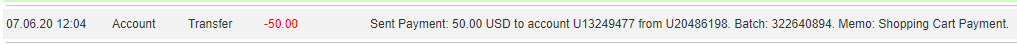 The amount of 50 USD has been withdrawn from your account. Accounts: U20->U13249477. Memo: Shopping Cart Payment. . Date: 19:21 05.07.20. Batch: 322554298.