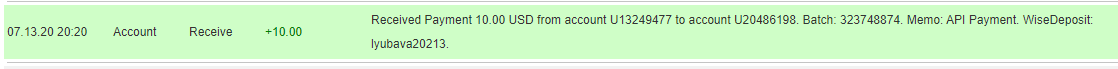 The amount of 1 USD has been deposited to your account. Accounts: U13249477->U12. Memo: API Payment. WiseDeposit. Date: 10:10 10.07.20. Batch: 323240126.