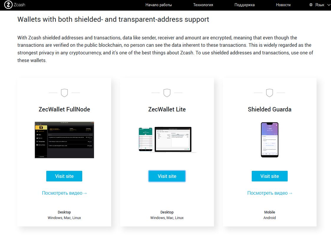 https://z.cash/Нам предлагают на выбор много кошельков, выбираем из них универсальный, который подходит и для компьютера и для телефонов.