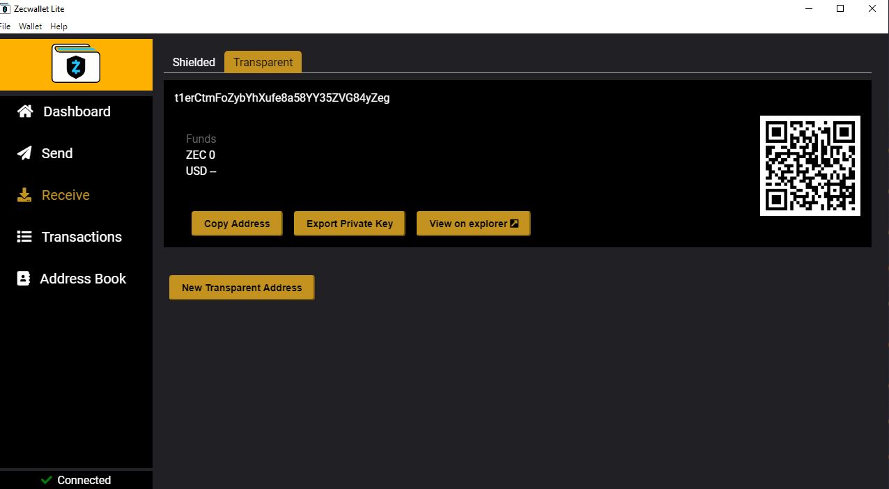 Находим адрес нашего кошелька в разделе Recieve в подразделе Transparent