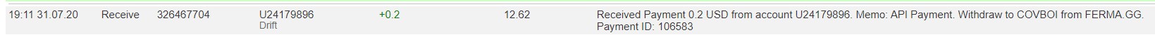 The amount of 0.69 USD has been deposited to your account. Accounts: U24179896->U190. Memo: API Payment. Withdraw from FERMA.GG.. Date: 05:30 30.07.20. Batch: 326204747.