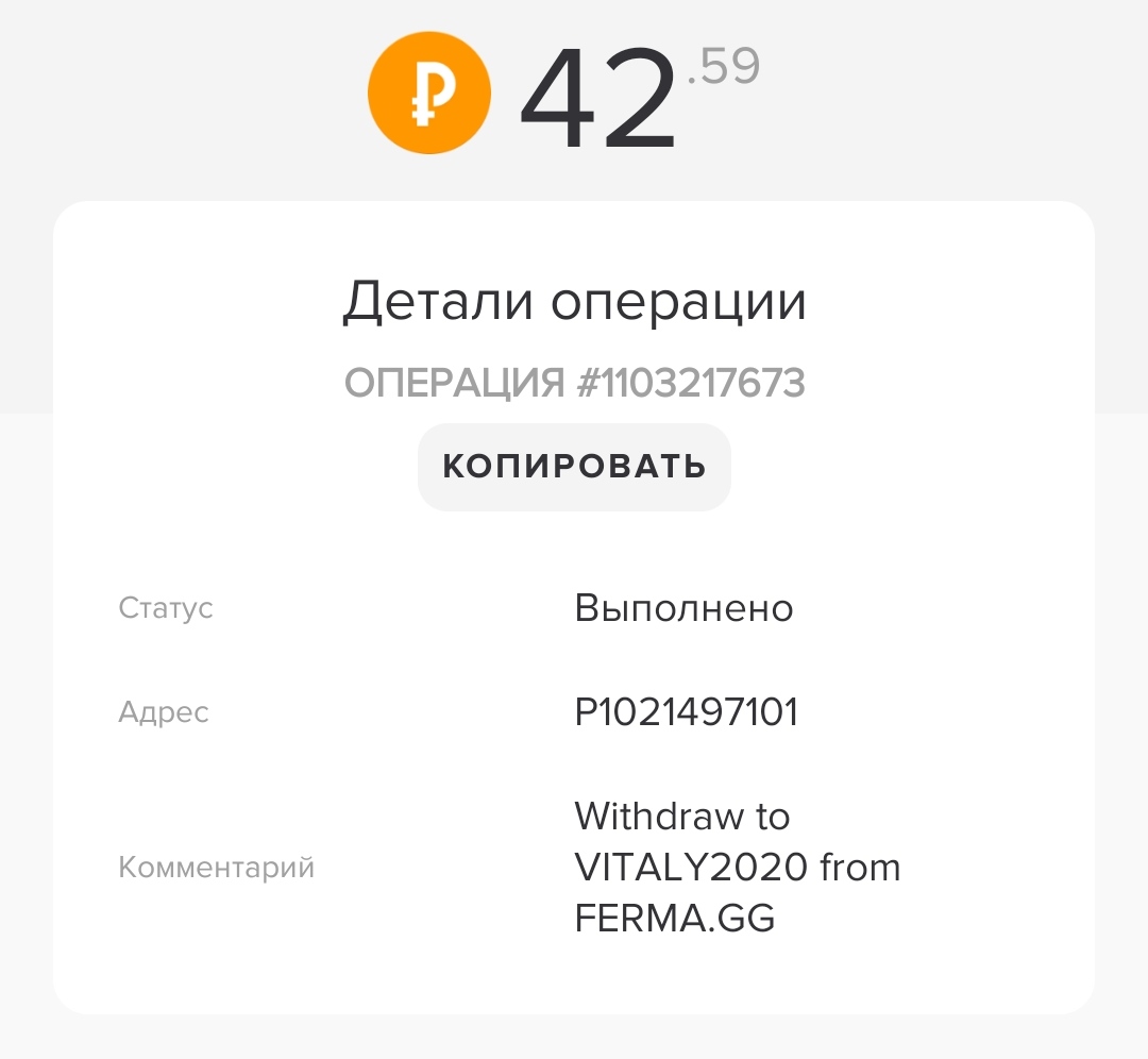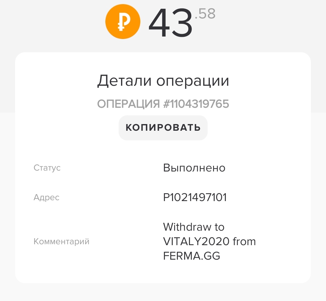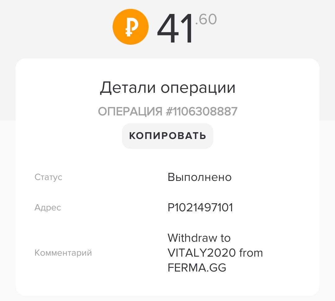 Comment: Amount: 10.00 RUB Withdraw from FERMA.GG
