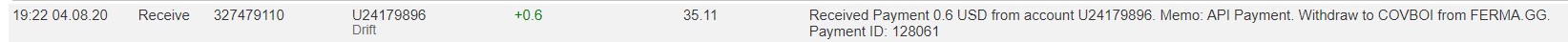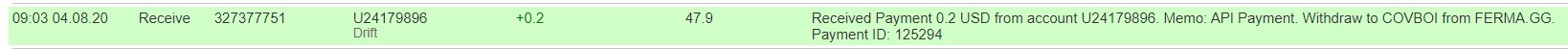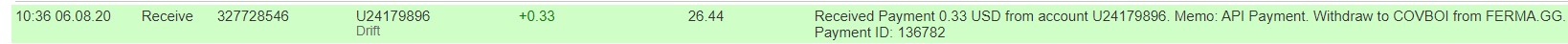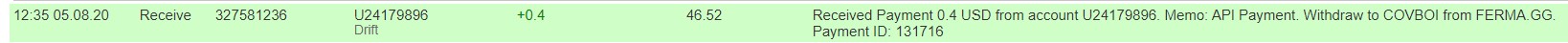 The amount of 0.46 USD has been deposited to your account. Accounts: U24179896->U1710. Memo: API Payment. Withdraw to OLGA from FERMA.GG.. Date: 05:32 05.08.20. Batch: 327519831.