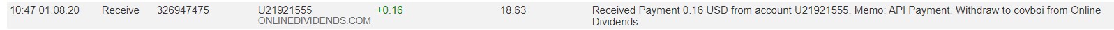 ONLINEDIVIDENDS.COM +0.16 39.93 Received Payment 0.16 USD from account U21921555. Memo: API Payment. Withdraw to covboi from Online Dividends.