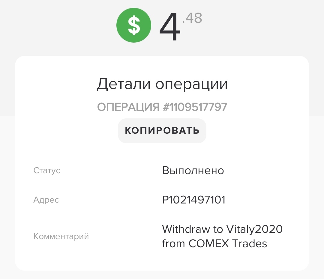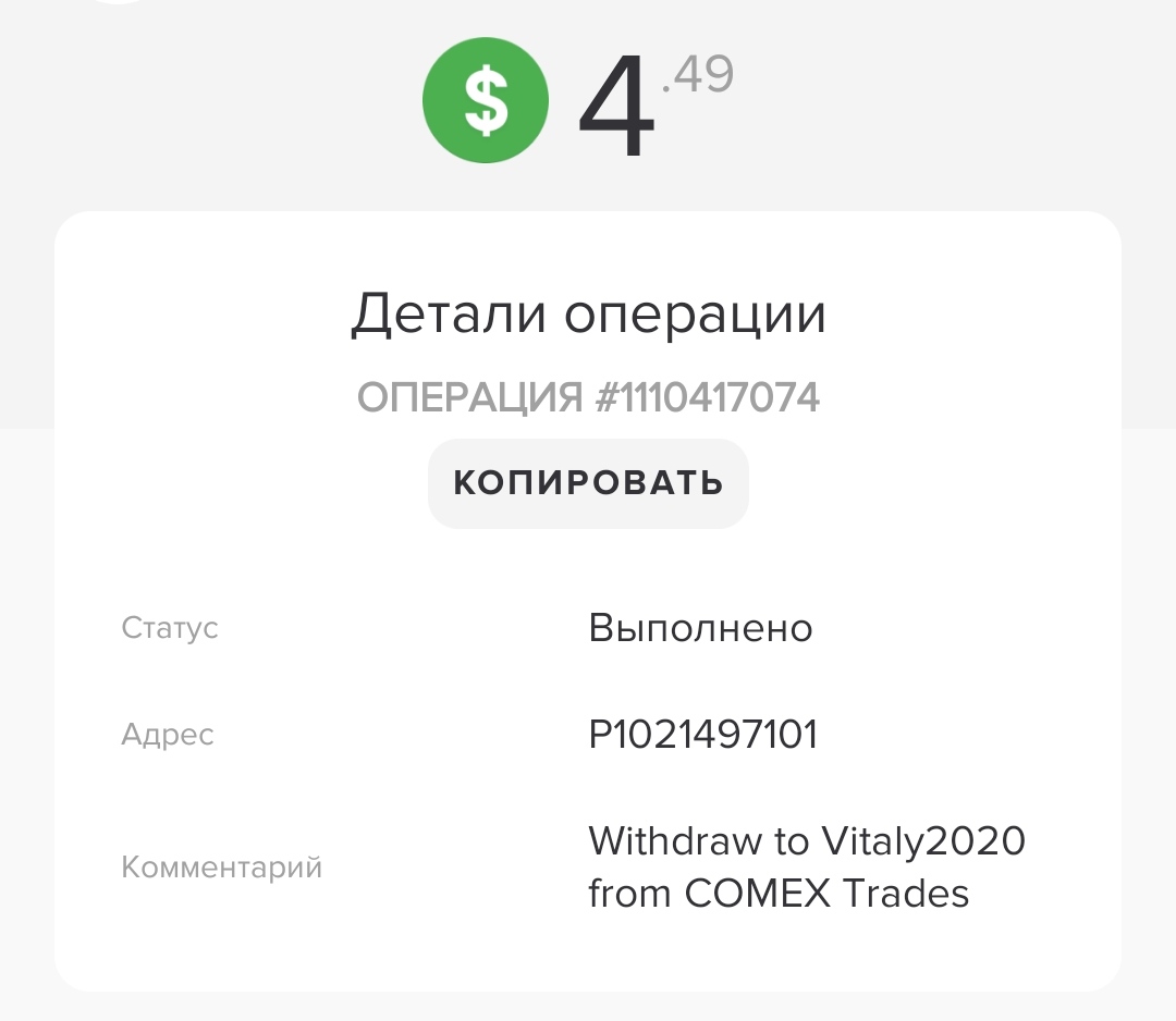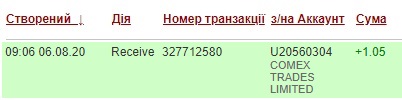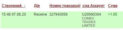 The amount of 1.05 USD has been deposited to your account. Accounts: U20560304->U1710. Memo: API Payment. Withdraw to olga from COMEX Trades.. Date: 10:51 09.08.20. Batch: 328188008.