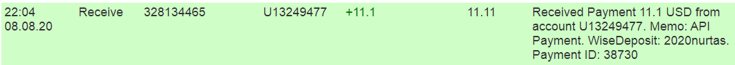 The amount of 1.05 USD has been deposited to your account. Accounts: U20560304->U216. Memo: API Payment. Withdraw to EkaterinaRodina from COMEX Trades.. Date: 15:49 07.08.20. Batch: 327943308.