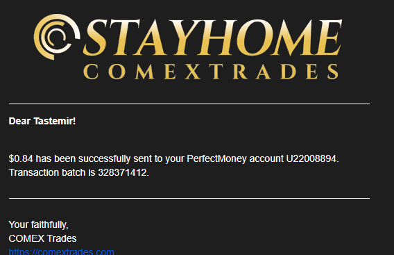 COMEX TRADES LIMITED +0.42 83.77 Received Payment 0.42 USD from account U20560304. Memo: API Payment. Withdraw to covboi from COMEX Trades.