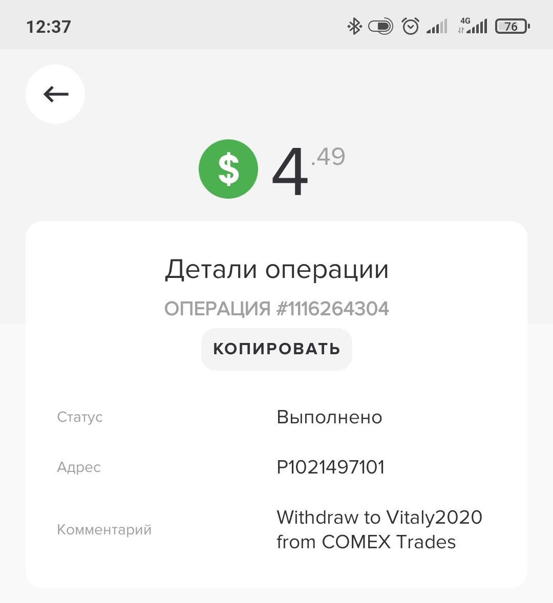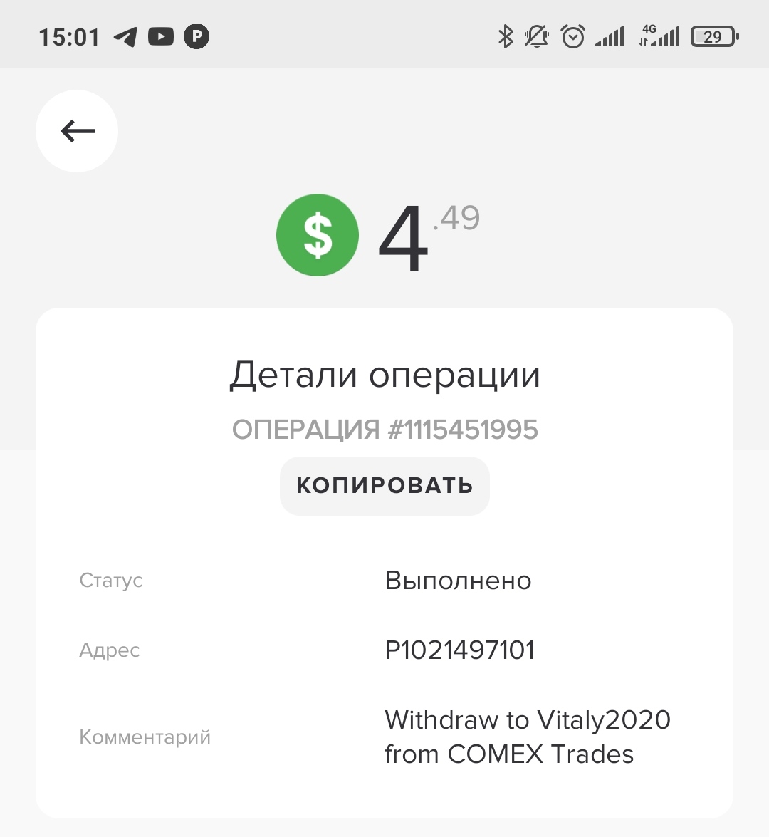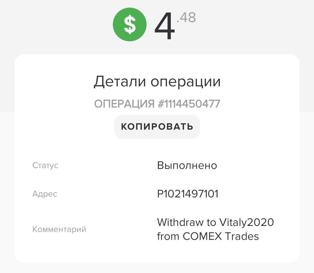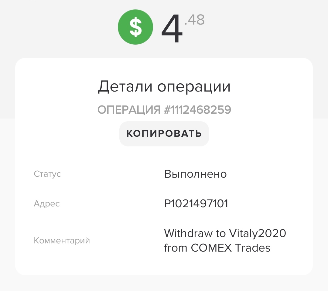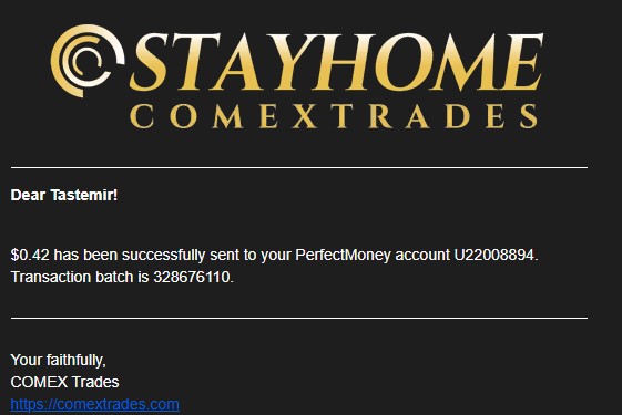 COMEX TRADES LIMITED +0.42 48.33 Received Payment 0.42 USD from account U20560304. Memo: API Payment. Withdraw to covboi from COMEX Trades.