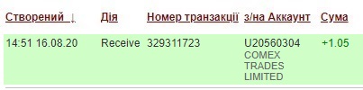COMEX TRADES LIMITED +0.42 11.24 Received Payment 0.42 USD from account U20560304. Memo: API Payment. Withdraw to covboi from COMEX Trades.