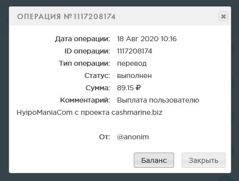 Комментарий: Выплата пользователю covboi с проекта cashmarine.biz