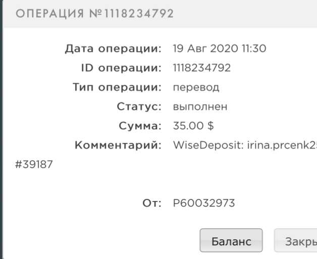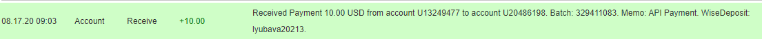 The amount of 1 USD has been deposited to your account. Accounts: U13249477->U12. Memo: API Payment. WiseDeposit. Date: 16:08 21.08.20. Batch: 330156986.