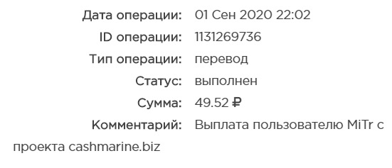 Комментарий: Выплата пользователю MiTr с проекта cashmarine.biz