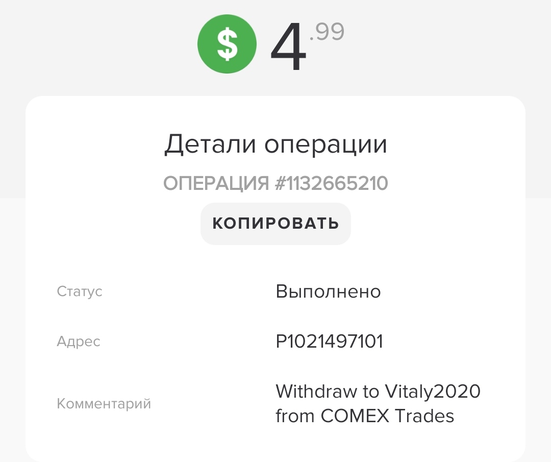 COMEX TRADES LIMITED +0.21 63.35 Received Payment 0.21 USD from account U20560304. Memo: API Payment. Withdraw to covboi from COMEX Trades.