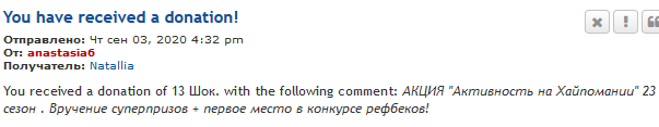Благодарю!!!!anastasia6 писал(а): ↑Чт авг 27, 2020 3:46 pmАКЦИЯ "Активность на Хайпомании" 22 сезон . Вручение суперпризов!
