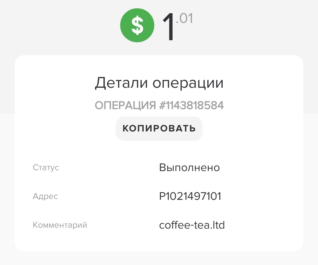 14.09.20 17:07 Receive Received Payment 0.8 USD from account U24989906 to account U773ХХХХ. Batch: 334365735. Memo: API Payment. coffee-tea.ltd.