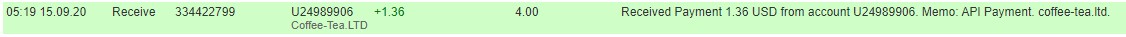 09.14.20 04:56 Account Receive +1.36 Received Payment 1.36 USD from account U24989906 to account U6951675. Batch: 334239456. Memo: API Payment. coffee-tea.ltd.