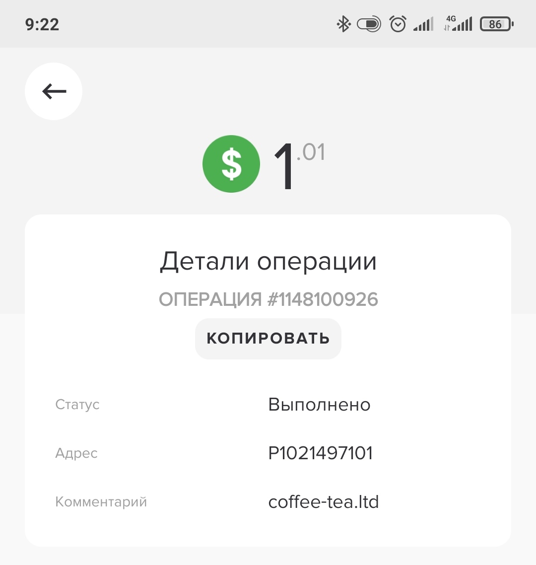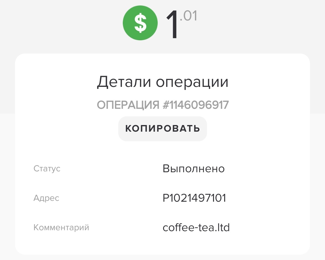 Получен платеж 1,36 USD со счета U24989906 на счет U6951675. Пакет: 335053072. Заметка: Платеж через API. coffee-tea.ltd.