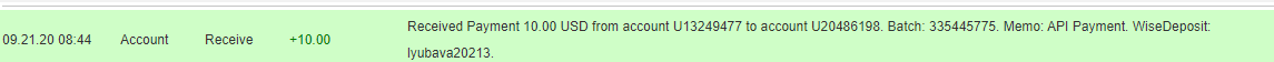 The amount of 1 USD has been deposited to your account. Accounts: U13249477->U12. Memo: API Payment. WiseDeposit.. Date: 18:42 22.09.20. Batch: 335748583.