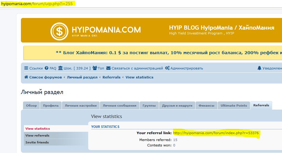 ВИП на ХайпоМании, реклама собственных инвестиционных проектов, получение бонуса партнерами, выведение денег из проекта. / VIP in HyipoMania, advertising of own investment projects, receiving a bonus by partners, withdrawing money from the project.