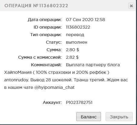 Выплата Кандидату в Партнеры блога ХайпоМания ( 100% страховки и 200% рефбек ) elisey. Вывод 28.7 шокелей. Транш второй. Рекомендации для получения статуса Партнера: https://hyipomania.com/forum/viewtopic.php?t=21837anastasia6 писал(а): ↑Пт авг 28, 2020 3:49 pm Выплата Партнеру блога ХайпоМания ( 100% страховки и 200% рефбек ) elisey. Вывод 28.7 шокелей. Транш первый. Ждем вас в нашем чате @hyipomania_chat