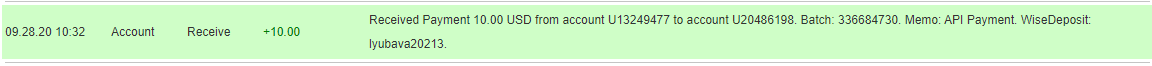 The amount of 21.36 USD has been deposited to your account. Accounts: U13249477->U16410***. Memo: API Payment. WiseDeposit: *******. Date: 10:22 02.10.20. Batch: 337882289.
