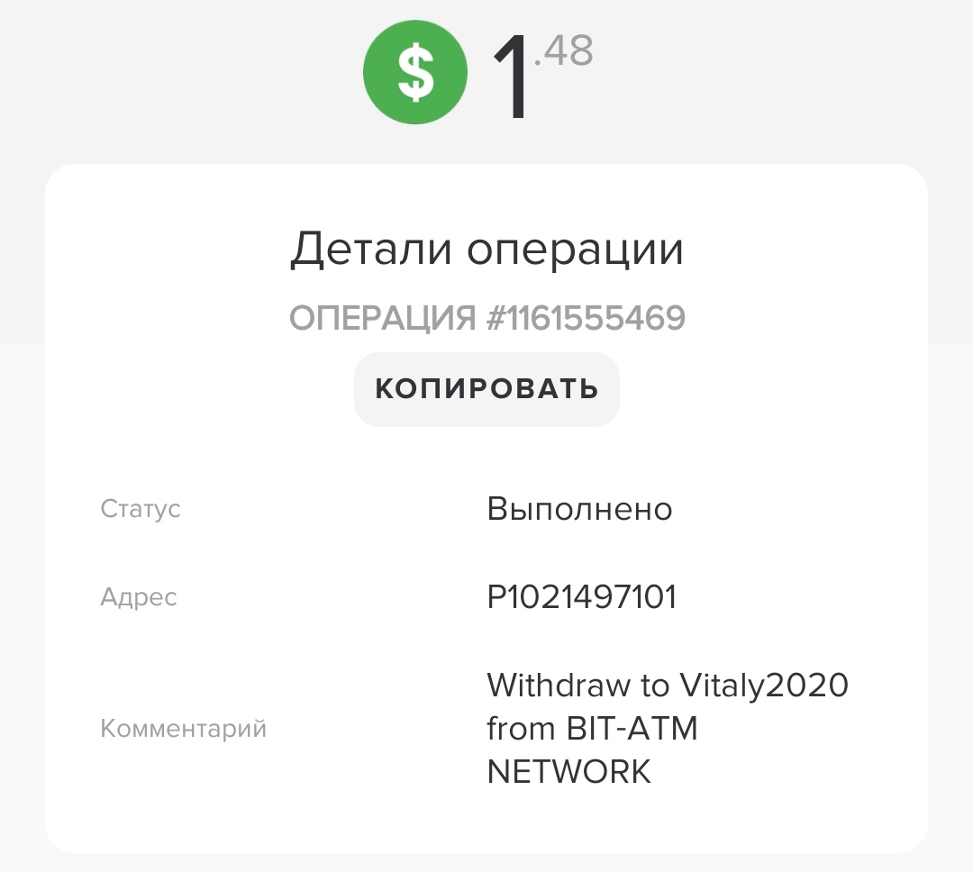 Выплата! The amount of 1.51 USD has been deposited to your account. Accounts: U23031321->U***. Memo: API Payment. Withdraw from BIT-ATM NETWORK.. Date: 09:56 01.10.20. Batch: 337262514.