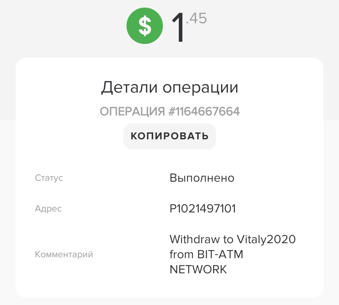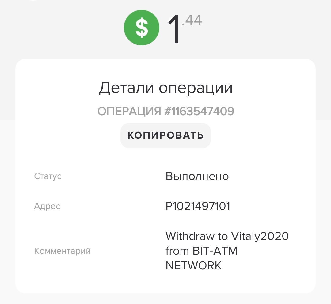 Withdraw to Vitaly2020 from BIT-ATM NETWORK