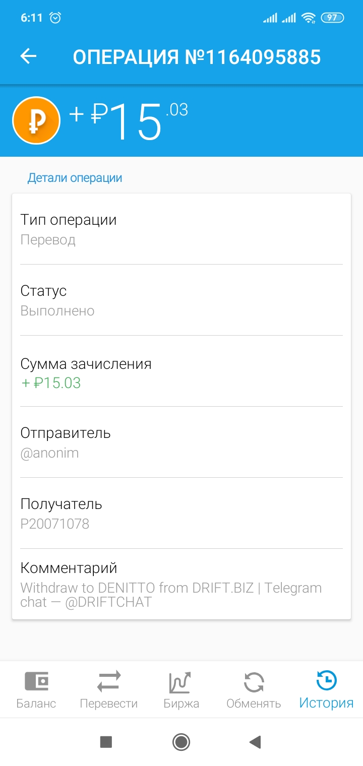 Комментарий: Withdraw to EVGENY80 from DRIFT.BIZ | Telegram chat — @DRIFTCHAT
