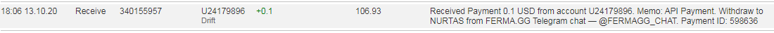 The amount of 0.47 USD has been deposited to your account. Accounts: U24179896->U190. Memo: API Payment. Withdraw from FERMA.GG Telegram chat — @FERMAGG_CHAT.. Date: 20:17 13.10.20. Batch: 340186067.