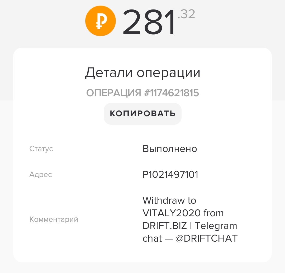 Комментарий: Withdraw to EVGENY80 from DRIFT.BIZ | Telegram chat — @DRIFTCHAT