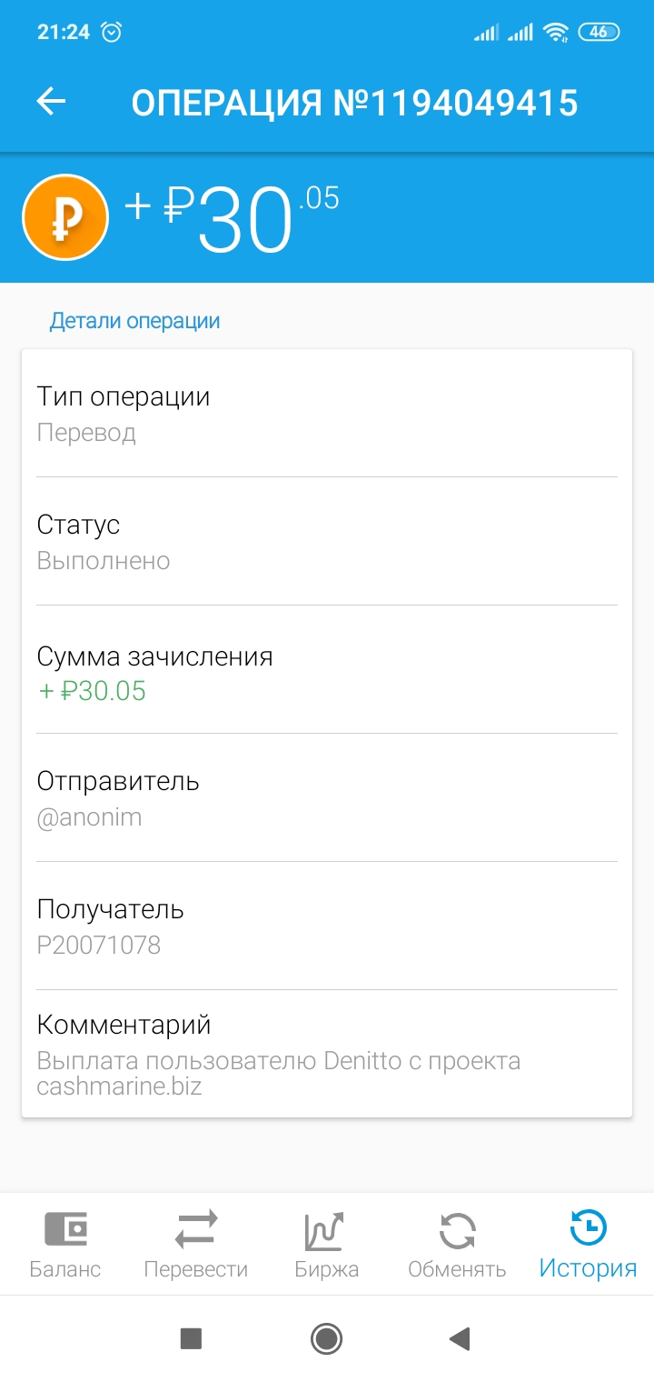 Комментарий: Выплата пользователю Evgeny80 с проекта cashmarine.biz