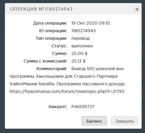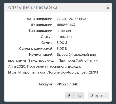 anastasia6 писал(а): ↑Вс ноя 01, 2020 5:17 pmСумма: 41.00 USD Выплата партнеру блога ХайпоМания ( 100% страховки и 200% рефбек ) Vitaly2020. Третий вывод по программе бесконечного пассивного дохода с блогом. В обороте: 410 шокелей. Капитал на 1.11 в Банке: 500 шокелей.anastasia6 писал(а): ↑Чт окт 01, 2020 4:03 pmanastasia6 писал(а): ↑Чт окт 01, 2020 4:01 pm