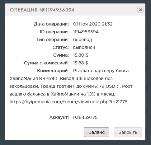 anastasia6 писал(а): ↑Чт окт 01, 2020 4:24 pm Выплата партнеру блога ХайпоМания ( 100% страховки и 200% рефбек ) RRProfit. Вывод 316 шокелей. Транш второй. Рост вашего баланса в ХайпоМании на 10% в месяц: viewtopic.php?t=21776