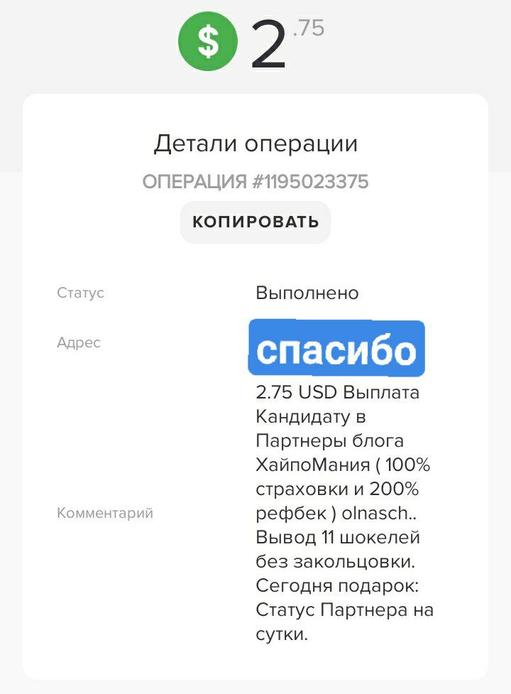 2.75 USD Выплата Кандидату в Партнеры блога ХайпоМания ( 100% страховки и 200% рефбек ) olnasch.. Вывод 11 шокелей без закольцовки. Сегодня подарок: Статус Партнера на сутки.