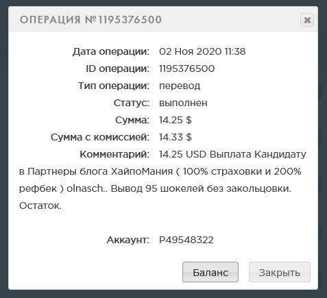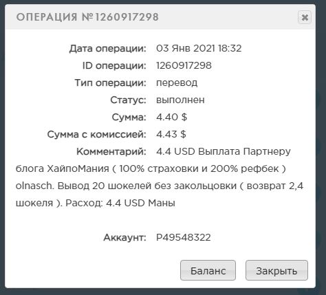 anastasia6 писал(а): ↑Вс ноя 01, 2020 4:36 pmСумма: 35.00 USD Выплата партнеру блога ХайпоМания ( 100% страховки и 200% рефбек ) Natallia. Пятый вывод по программе бесконечного пассивного дохода с блогом. В обороте: 350 шокелей. Капитал на 1.11 в Банке: 500 шокелей