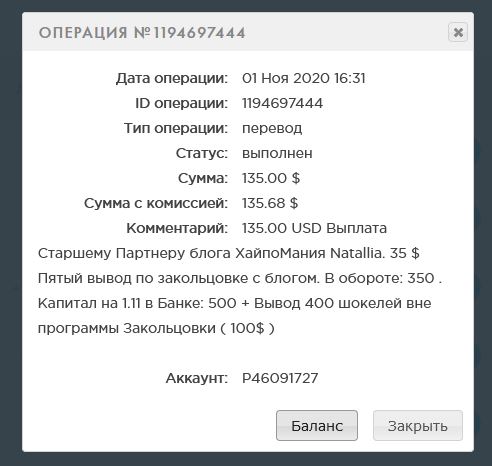 anastasia6 писал(а): ↑Вс ноя 01, 2020 4:36 pmСумма: 35.00 USD Выплата партнеру блога ХайпоМания ( 100% страховки и 200% рефбек ) Natallia. Пятый вывод по программе бесконечного пассивного дохода с блогом. В обороте: 350 шокелей. Капитал на 1.11 в Банке: 500 шокелей