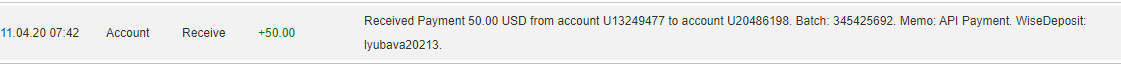 06.11.20 23:12 Received Payment 50.1 USD from account U13249477 to account U77ХХХ.