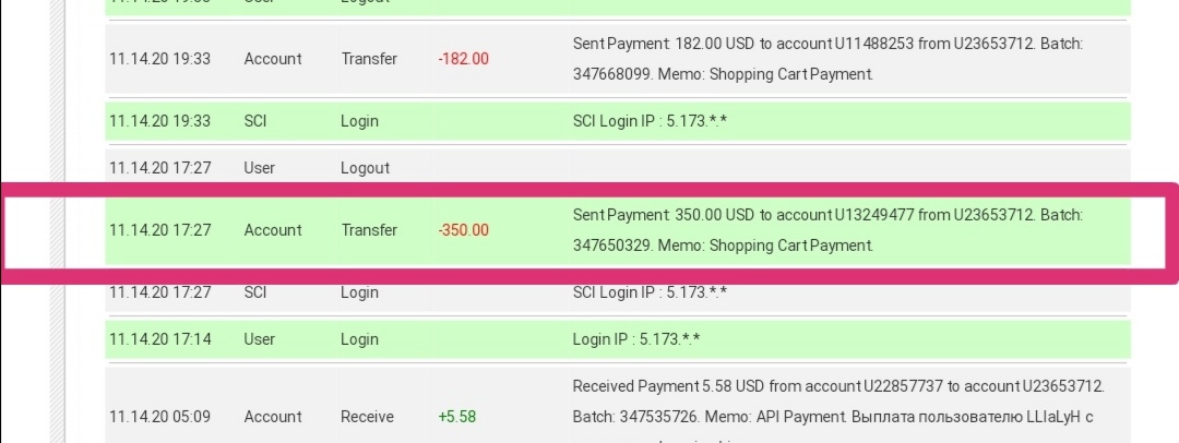 13.11.20 22:03 Received Payment 50.5 USD from account U13249477 to account U77ХХХХХ.