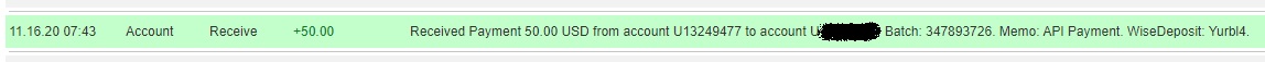 11.16.20 07:43 Account Receive +50.00 Received Payment 50.00 USD from account U13249477. Batch: 347893726. Memo: API Payment. WiseDeposit: Yurbl4.