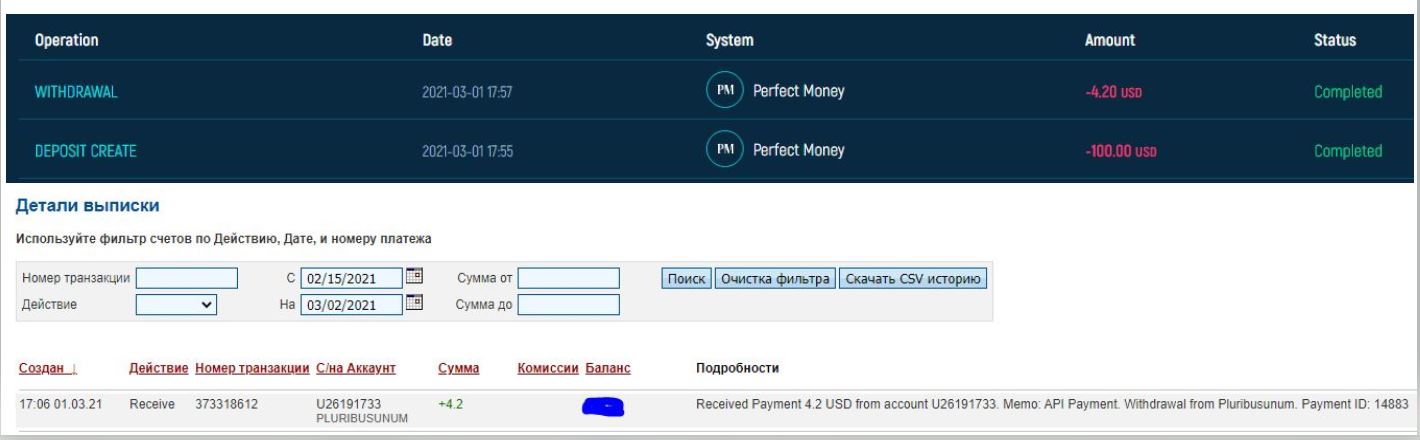 The amount of 0.42 USD has been deposited to your account. Accounts: U26191733->U21313***. Memo: API Payment. Withdrawal from Pluribusunum.. Date: 18:20 07.03.21. Batch: 375026646.