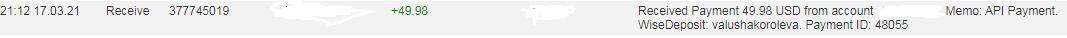 Received Payment 60.00 USD from account U13249477 to account U25515230. Batch: 379142010. Memo: API Payment. WiseDeposit: troshkinev.